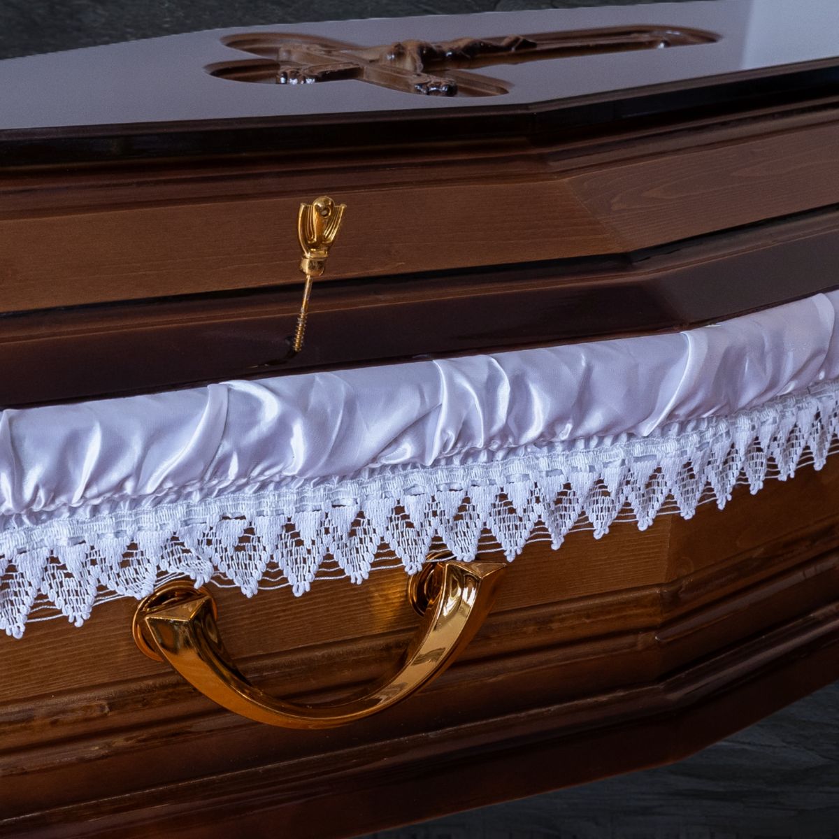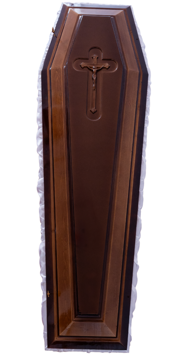 Sicriu complet echipat, confecționat din molid cu finisaj pin antichizat. Capac profilat, detalii sculptate și cruce integrată, pentru o prezentare demnă și o despărțire în ton cu valorile creștine.
