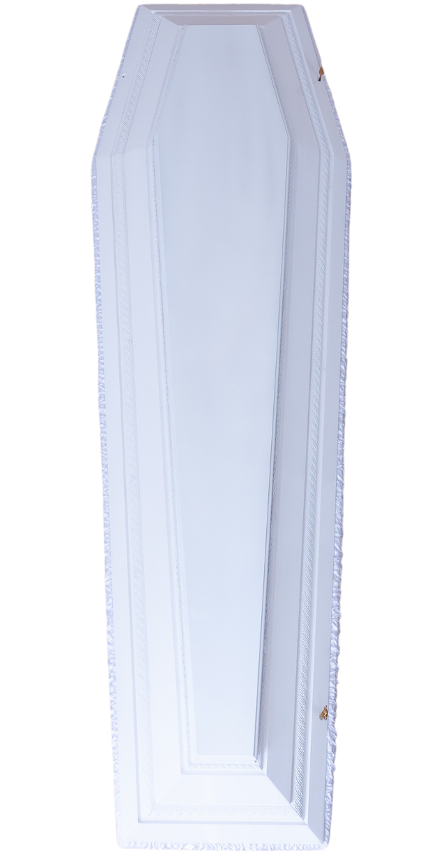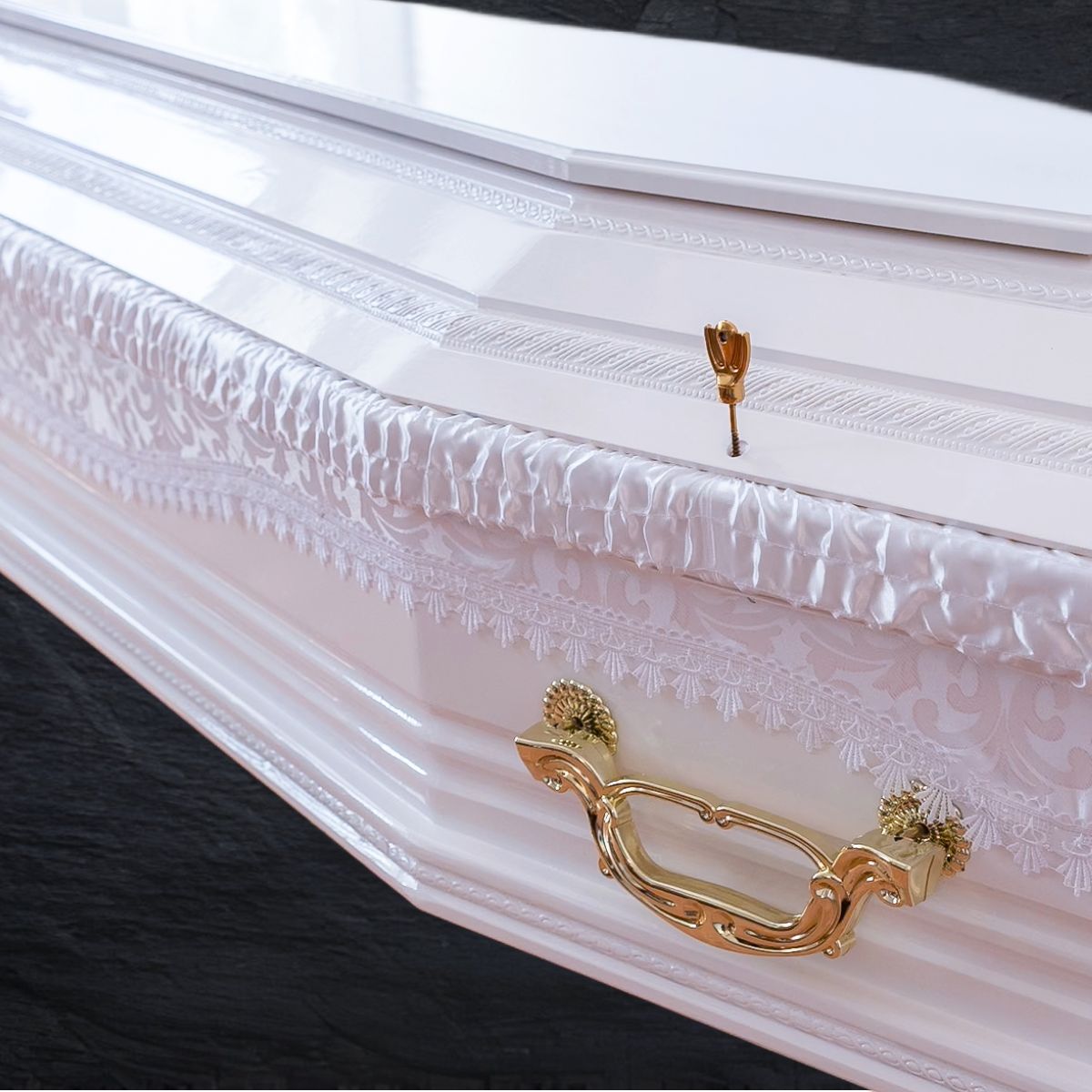 Realizat din lemn de molid și finisat alb mat, acest sicriu îmbină simplitatea cu eleganța. Este complet echipat, având detalii lucrate cu grijă și textil elegant din brocard și saten.