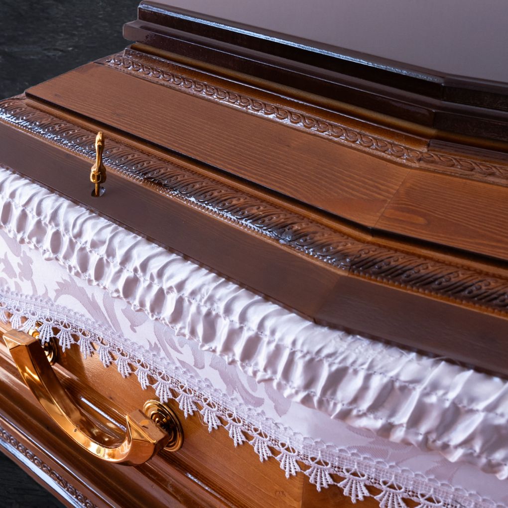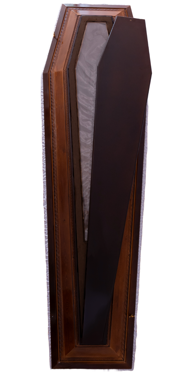 Sicriu modern, cu deschidere separată și geam la cap, din molid finisat coniac. Interiorul tapițat cu textil elegant din brocard și saten și ornamentele fine adaugă un plus de distincție.