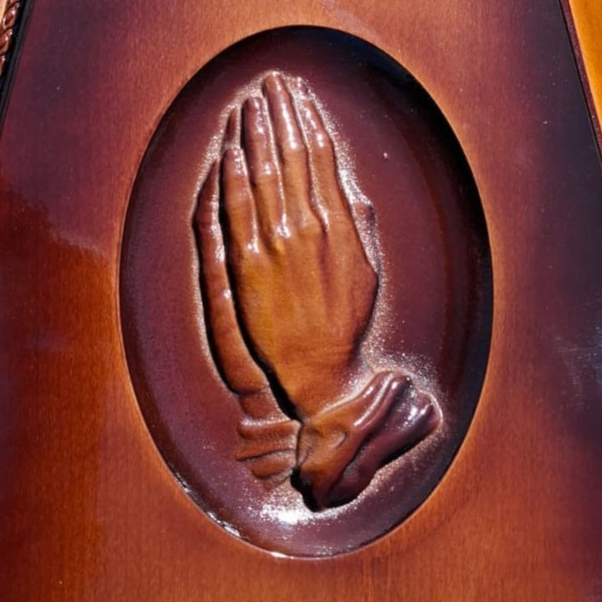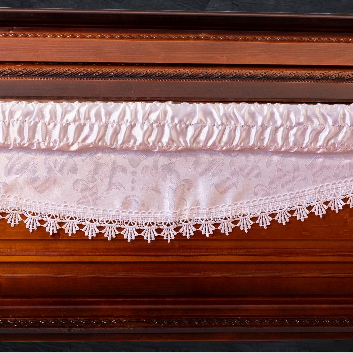 Model clasic din molid masiv, cu luciu coniac în degrade și echipare completă. Interiorul este îmbrăcat în textil elegant din brocard și saten, oferind un cadru demn și respectuos de rămas-bun.