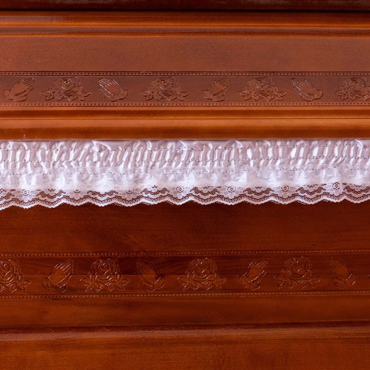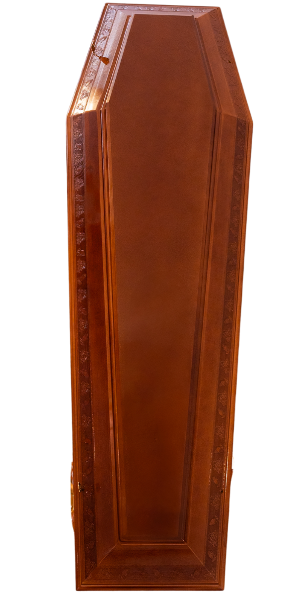 Lemn de fag în nuanță coniac, cu dantelă delicată și motive ornamentale. Sicriu complet echipat, construit cu grijă pentru un ultim omagiu în spirit de pace și liniște.
