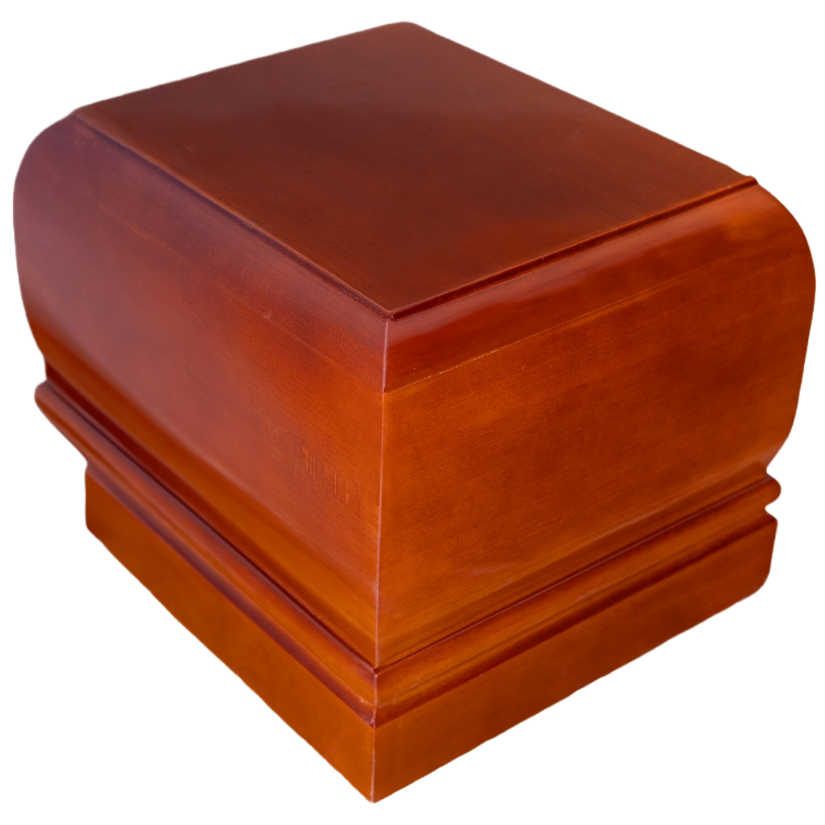 Urnă rectangulară, cu margini rotunjite și suprafață netedă. Lemnul atent finisat oferă un omagiu simplu și respectuos, dedicat celor care au prețuit naturalețea și liniștea.
