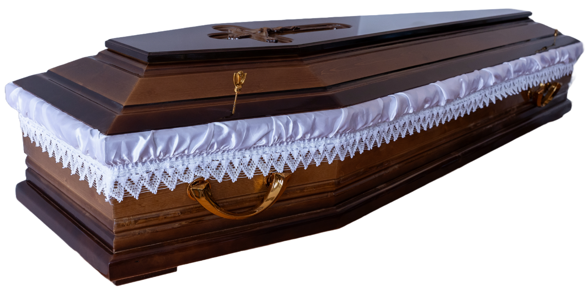 Fully equipped coffin made of spruce with an antique pine gradient finish. Profiled lid, carved details, and integrated cross offer a dignified farewell rooted in Christian values.