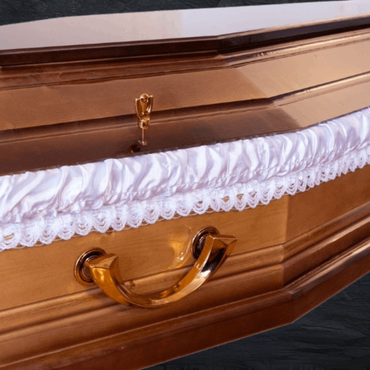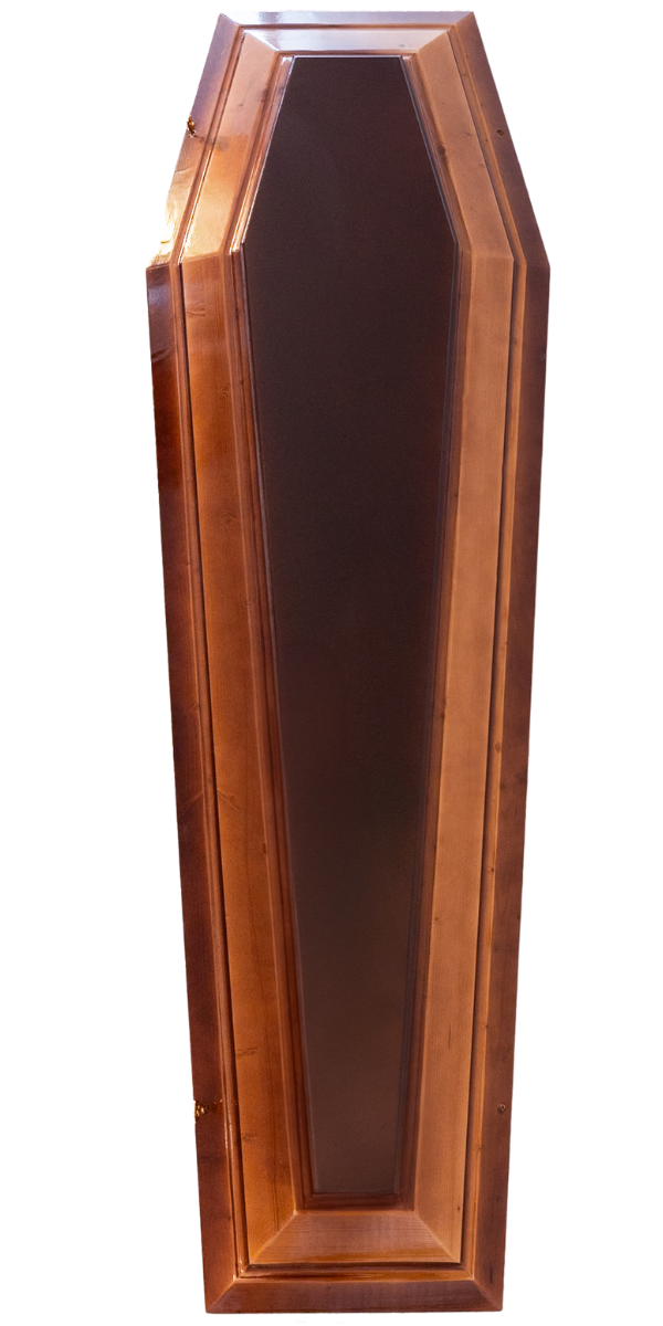 Classic coffin made of spruce with a natural gradient finish, quality detailing, and full interior. Suitable for dignified and elegant funeral ceremonies, evoking peace and nobility.