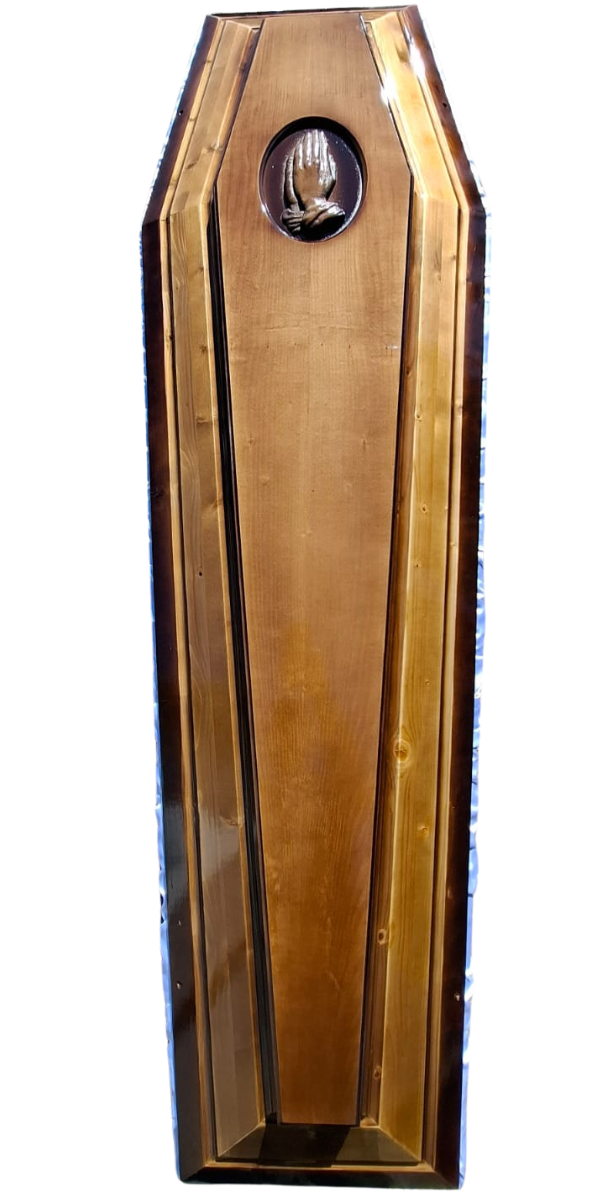 Coffin made of spruce wood with a gradient finish, adorned with white lace and a lid sculpted with praying hands. A solemn design, fully equipped for a meaningful tribute.