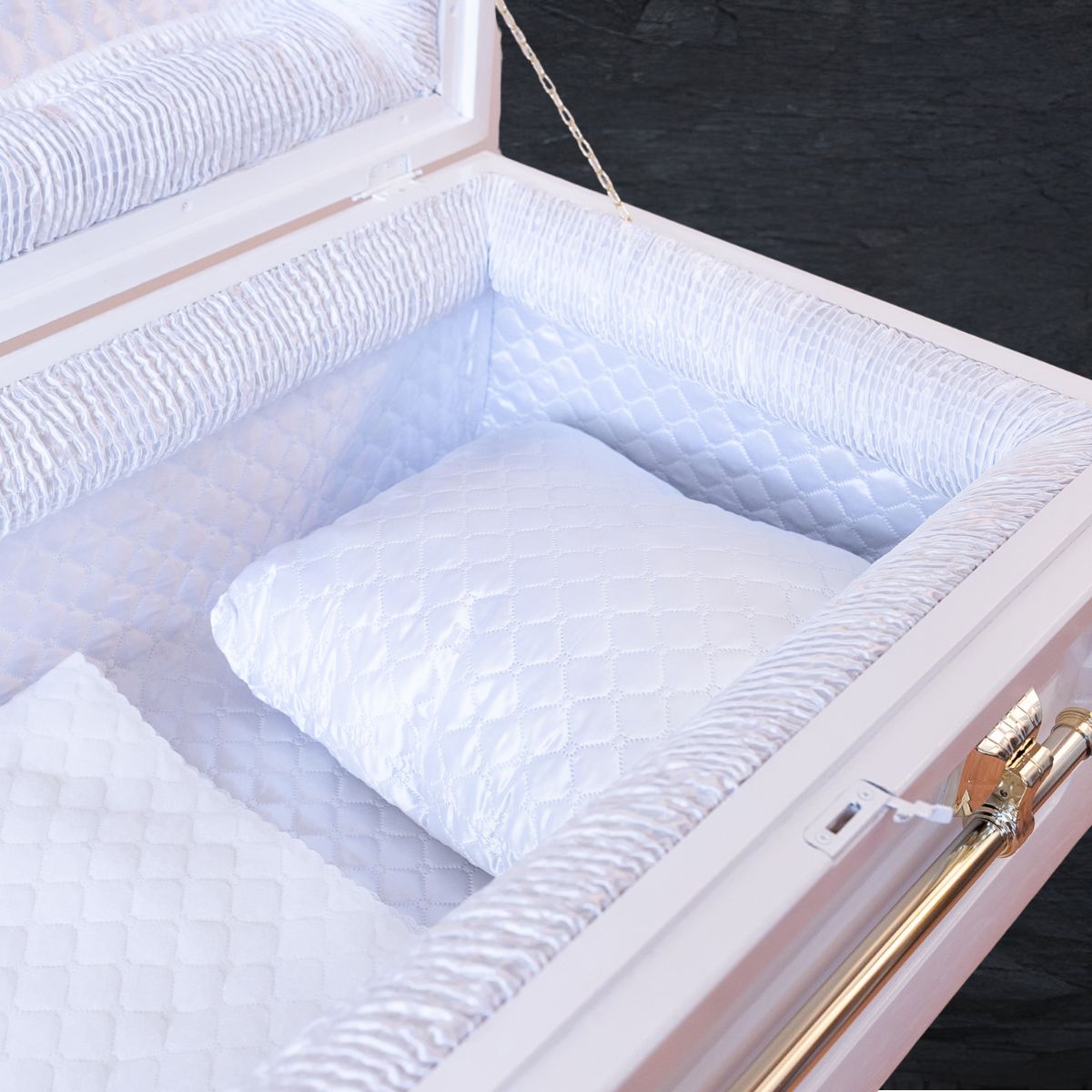 Crafted from white beech wood, this distinguished model stands out through its simplicity and balance. The fully lined interior in elegant brocade and satin adds a sense of refinement and inner peace.