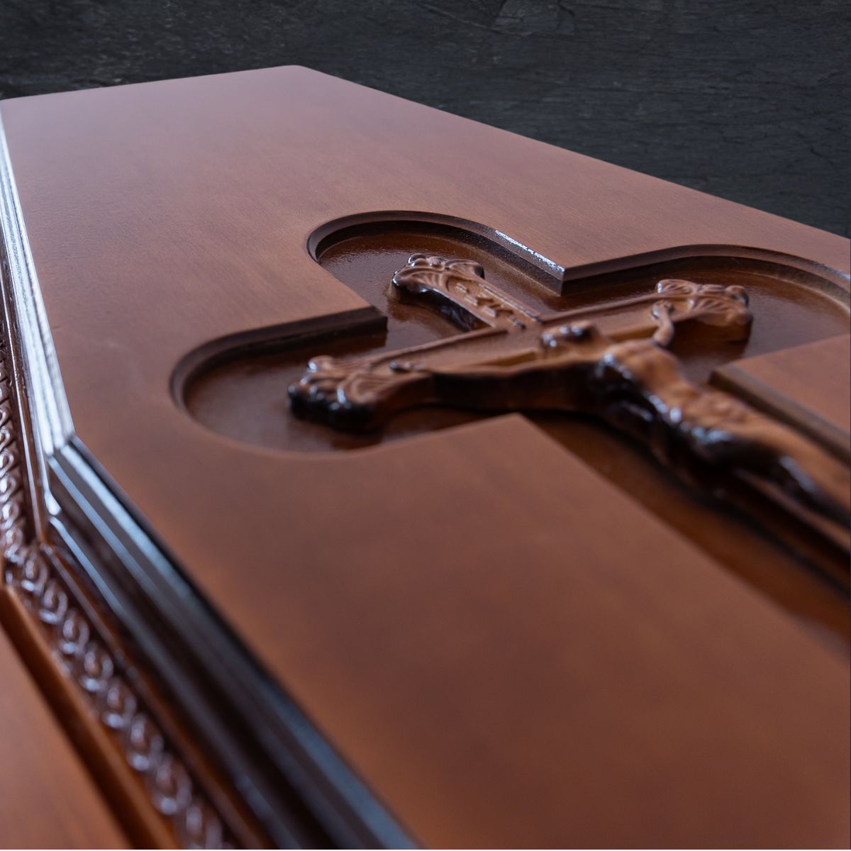 Made from spruce and finished in antique pine tones, this classic coffin features a sculpted crucifix on the lid and elegant interior lining in brocade and satin – a symbol of deep respect.
