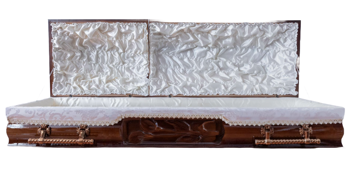 Crafted from poplar and finished in warm walnut tones, this double-lid coffin stands out through its sobriety, subtle carvings, and an interior lined with elegant brocade and satin fabric.