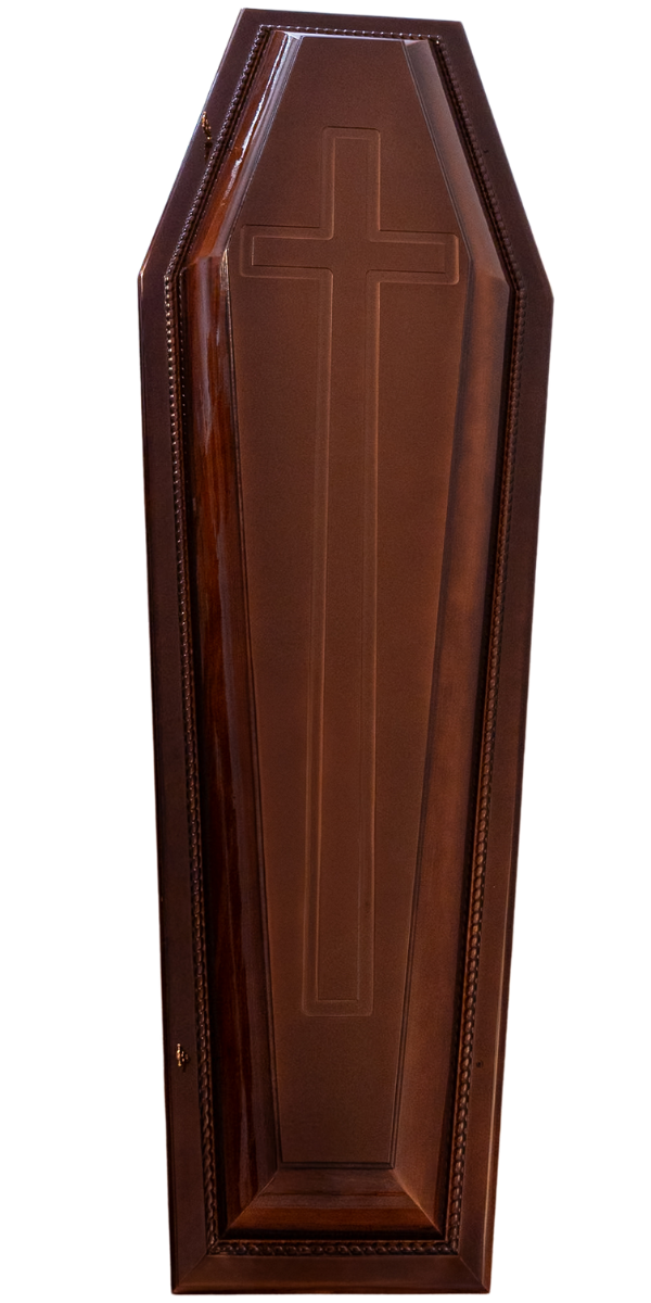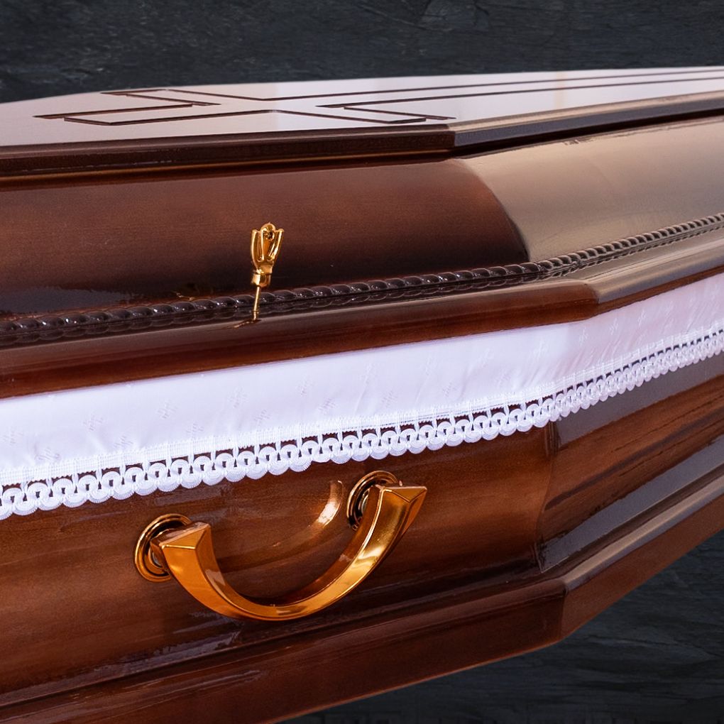 Coffin made from linden and poplar wood, featuring a deep walnut gloss, fine carvings, and a fully lined interior with elegant brocade and satin textiles – perfect for refined ceremonies.