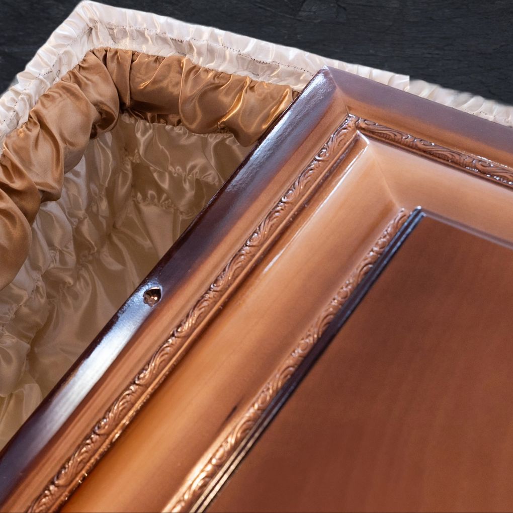 Fully equipped coffin made of linden and poplar wood, with a patinated chestnut finish. The interior is lined with elegant brocade and satin textiles, complemented by carefully crafted details.