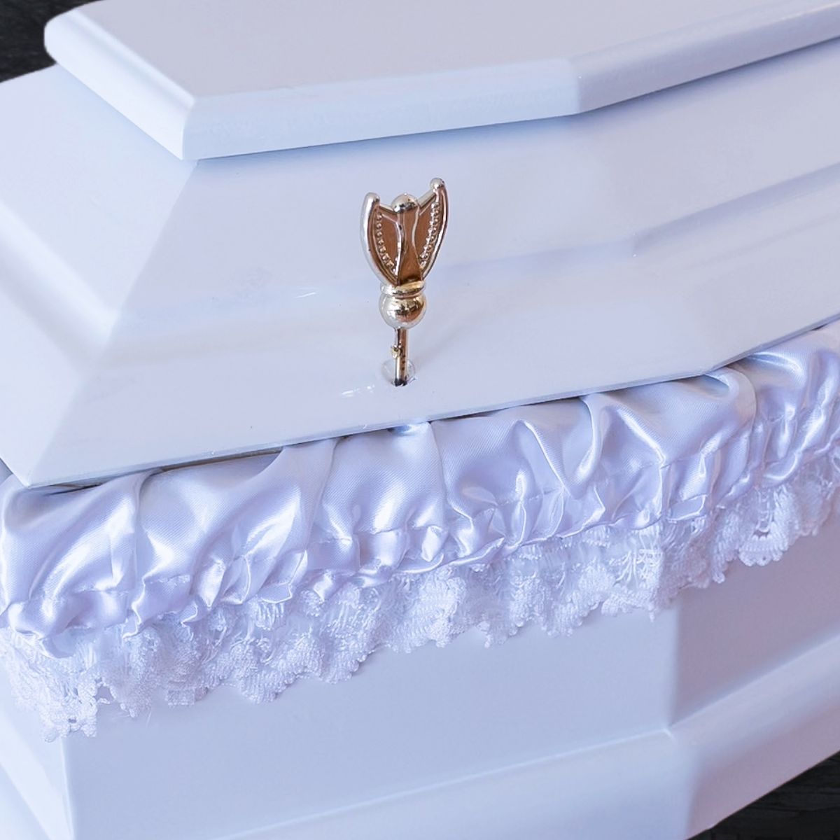Made from spruce wood and flawlessly finished in white, this child’s coffin offers a noble appearance. Fully equipped and available in various sizes, it is suited for an emotional and dignified ceremony.