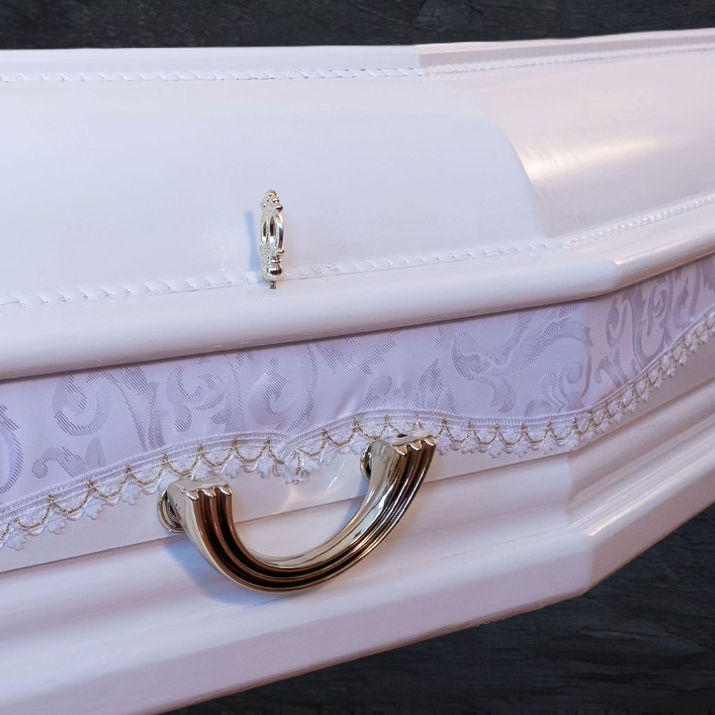 With a clean and distinguished design, this white coffin made of poplar and linden wood is fully equipped, featuring an elegant interior lined with brocade and satin—offering a dignified and peaceful farewell.