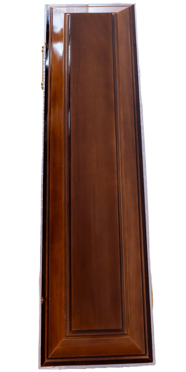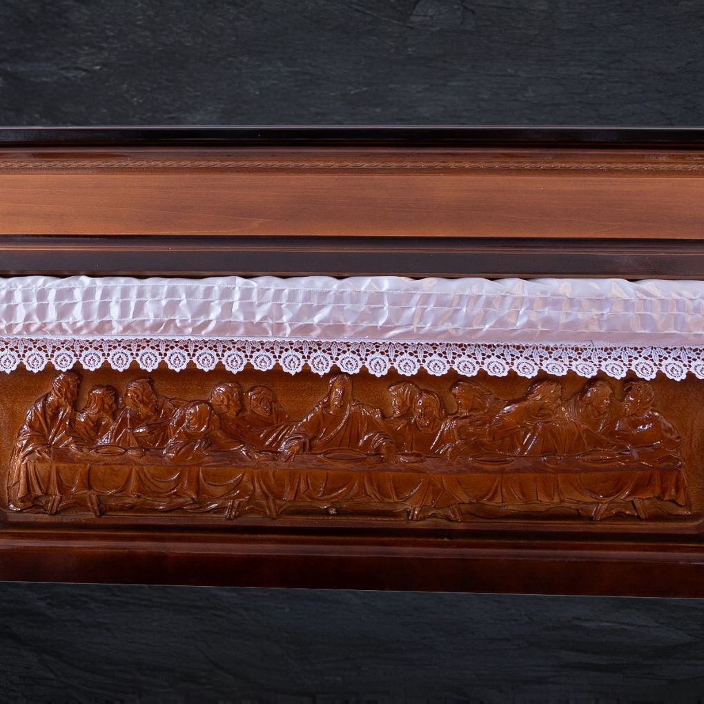 Crafted from linden and poplar wood, this fully equipped coffin features an elegant pine-tone degrade finish and a side carving depicting the Last Supper, offering deep symbolic meaning.