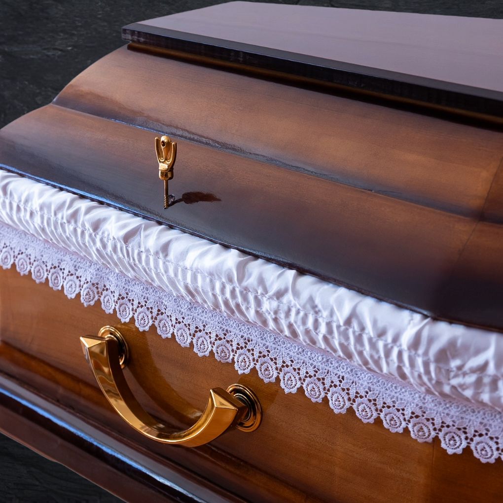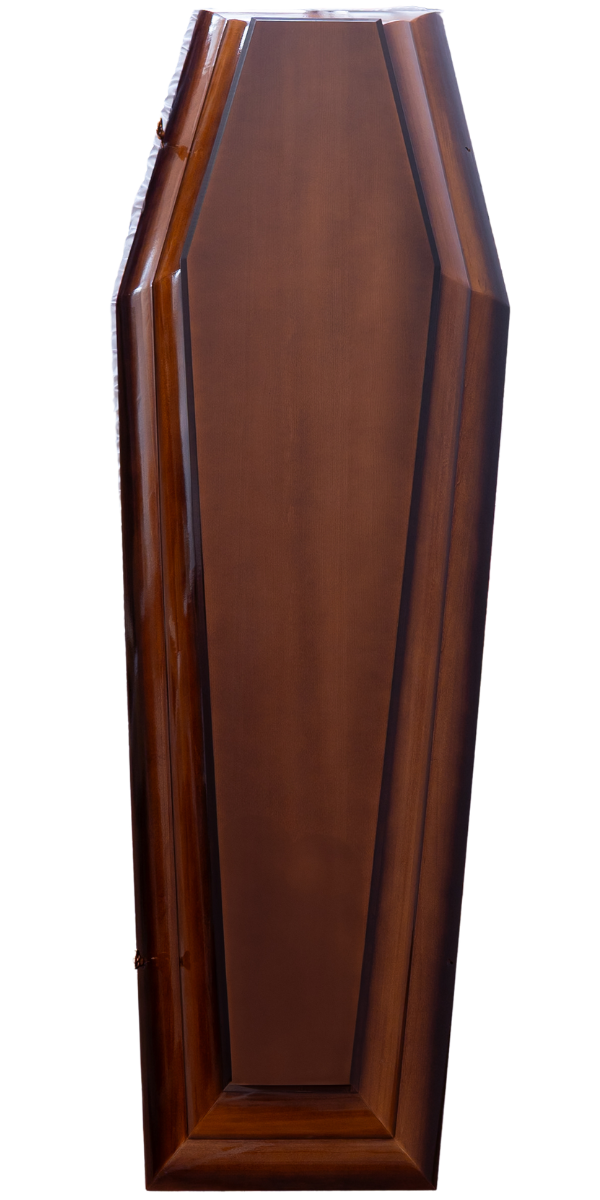 Fully equipped coffin made from poplar and linden wood, featuring a classic design with polished coniac-toned gradient. Suitable for a sober yet distinctive tribute, with carefully crafted details.